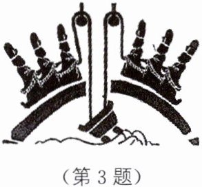 3.不能 $F_{1}+F_{2}$ 减小 解析:题图中的滑轮是固定的,不能随重物一起移动,所以是定滑轮,定滑轮不能省力和省距离,只能改变力的方向;两边绳子都对鼎施加竖直向上的拉力,所以鼎受到的拉力之和$F_{合}=F_{1}+F_{2}$;鼎在水中上升的过程中,其底部在水中的深度逐渐减小,由于液体压强随深度的减小而减小,所以其底部所受水的压强减小。