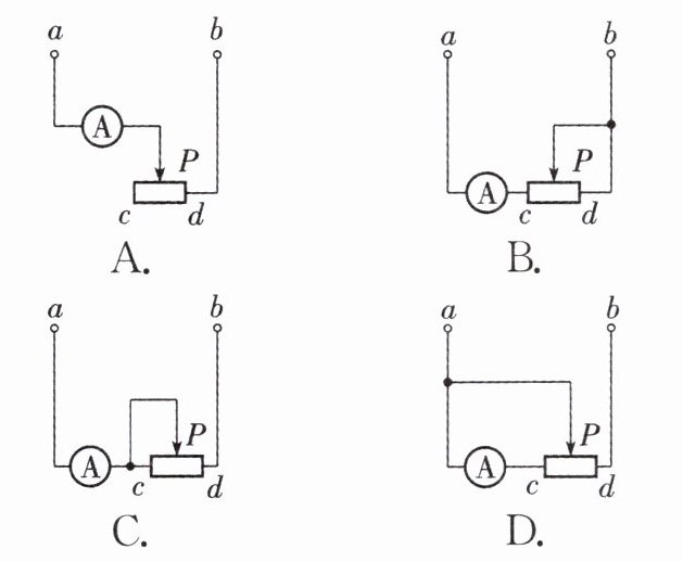B 解析:本题中 Uₐb 一定,假设电流从 a 点流进,b 点流出,则 A 选项中电流表与 Pd 段串联,当 P 向 d 端移动时,Pd 段变短,电阻变小,电流表的示数变大;B 选项中电流表与 cP 段串联,Pd 段被局部短路,当 P 向 d 端移动时,cP 段变长,电阻变大,电流表的示数变小;C 选项中电流表与 Pd 段串联,cP 段被局部短路,其电路与 A 选项中的电路等效,结论相同;D 选项中电流表与 cP 段串联后被局部短路,电流只流过 Pd 段,当 P 向 d 端移动时,电流表的示数始终为零。