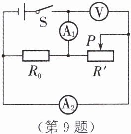 9. 如图所示的电路中,电源电压恒定。R₀是定值电阻,闭合开关S,在向右移动滑动变阻器滑片P的过程中,三个电表示数的变化情况如下:电流表$A_1$的示数 ,电流表$A_2$的示数 ,电压表V的示数 。