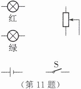 11. 如图所示,现有一个电源,一个滑动变阻器,红、绿灯各一盏,开关一个和若干导线,请你设计一个由滑动变阻器控制的电路,要求红灯变暗时绿灯变亮,绿灯变暗时红灯变亮。