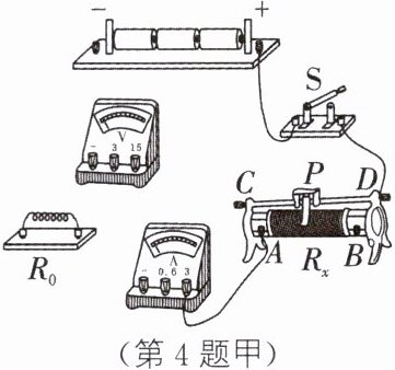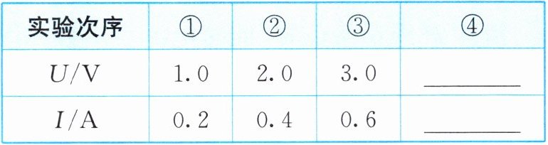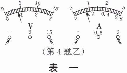 (4)排除电路故障,移动滑动变阻器的滑片P,测得多组数据。进行实验④时,电压表、电流表的示数如图乙所示,请将数据记录在表一内。