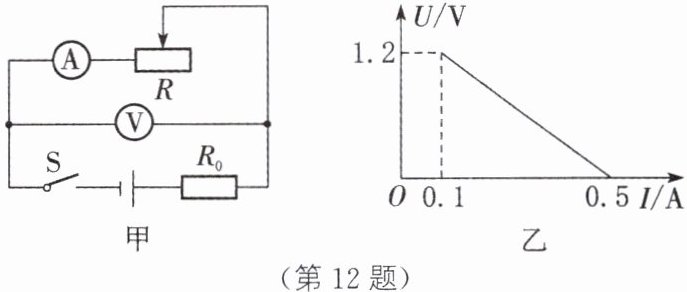 12. ★(2024·临沂)闭合如图甲所示的电路的开关,将滑动变阻器的滑片由最右端移到最左端的过程中,电压表与电流表的示数变化的图像如图乙所示,则定值电阻$R_0$的阻值为______Ω,电源电压为______V。