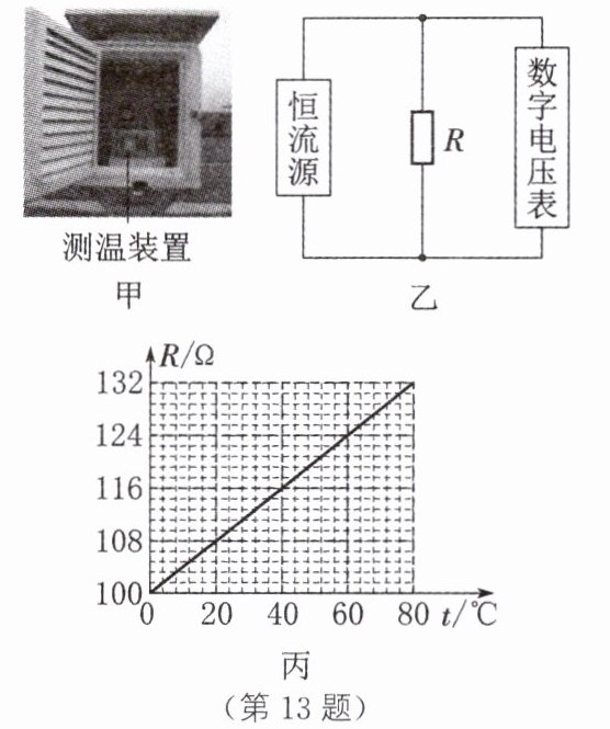 13. (2024·北京)图甲为自动气象站的测温装置,它的测温电路可简化为图乙,其中的“恒流源”是一个特殊电源,电流大小由电源内部结构决定,当电阻 R 变化时,通过 R 的电流大小保持不变。电阻 R 的阻值随温度的变化规律如图丙所示,通过数字电压表的示数可反映环境的温度。某次环境温度从 20℃上升到 30℃,电压表的示数变化了 8 mV。当温度的变化值相同时,电压表示数的变化值越大,该测温装置的灵敏度越高。下列说法中,正确的是( )