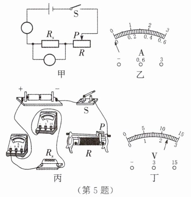 (4)测得的部分数据已记录在表格中,表格中第一行的最后一栏内应填写的内容是______。第3次测量时,电压表的示数如图丁所示,根据这3次测得的数据,$R_x$阻值的平均值为______Ω。