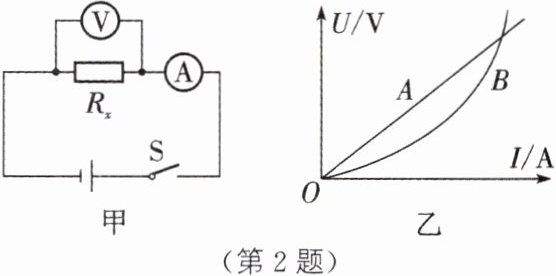 2. (2023·成都)实验小组设计如图甲所示的电路来测量未知定值电阻$R_x$的阻值,小富提出,这样只能得到一组数据,测量结果的误差可能较大。为了减小误差,需要进行多次测量,应该在电路中串联一个______。他们利用改进后的电路进行实验,并绘制出$R_x$的电压—电流图像。如图乙所示的A、B两条图线中,______是他们绘制出的图线。