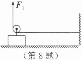 8. 如图所示,一木块放在水平地面上,上表面固定一轻滑轮(不计滑轮摩擦)。轻绳绕过滑轮后,一端固定在右侧墙上,另一端始终用大小为$F_{1}$的力竖直向上拉,木块向右匀速运动。这个过程中木块受到的摩擦力大小为______。若将绳端拉力方向改为水平向右,木块仍能匀速运动,这时拉力的大小为$F_{2}$,则$F_{2}$______(>/= /<)$\frac{1}{2}F_{1}$。
