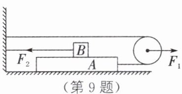 9. 易错题 用水平力$F_{1}$拉动如图所示的装置,使木板A在粗糙水平面上向右匀速运动,物块B置于木板A上表面,相对地面静止,连接B与竖直墙壁之间的水平绳的拉力大小为$F_{2}$。不计滑轮重、绳重及绳与滑轮间的摩擦,则$F_{1}与F_{2}$的大小关系是( )
