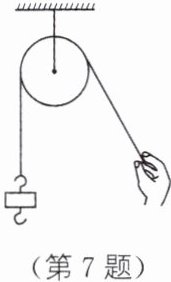 7. 定滑轮在使用时相当于一个杠杆。如图所示,某人用绳子沿着倾斜方向通过定滑轮拉住钩码,已知人手的拉力为F,钩码的重力为G。