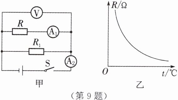 9. (2023·黄冈)课后服务时间,老师和物理兴趣小组的同学用一个热敏电阻与其他电学元件组成了如图甲所示的电路。电源电压恒定不变$,R_1$是定值电阻,R是热敏电阻,其阻值R与温度t的关系如图乙所示。开关S闭合,热敏电阻的温度升高时,下列说法中,正确的是( )