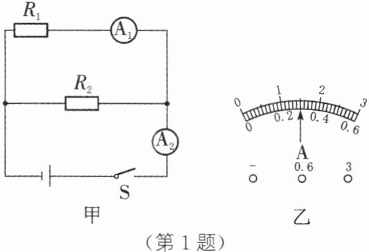 1. (2023·临沂)如图甲所示的电路中,电源电压为3 V,闭合开关后,两电流表的指针偏转情况均如图乙所示,则电路的总电阻为______Ω;断开开关后,电阻$R_2$的阻值为______Ω。