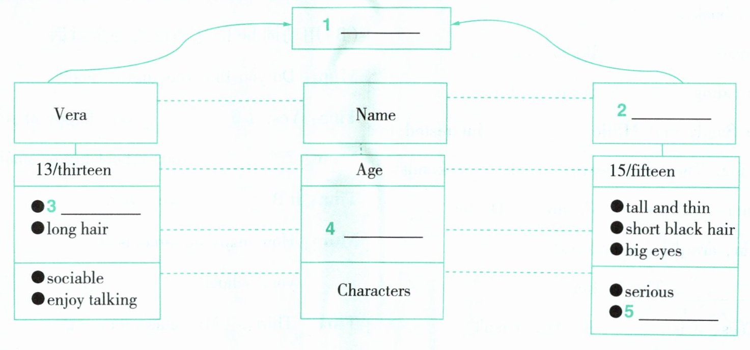 1 B 数字计算题。根据第二段中的“She is fifteen years old. She is two years older than me”可知,Nelly比Vera大两岁。Nelly十五岁了,所以Vera应该是十三岁。故选B。2 A 细节理解题。根据第二段中的“We live in the same town and we began to know each other when we were very young”可知,Nelly和Vera很小的时候就认识了。故选A。3 C 词义猜测题。根据第二段中的“enjoy talking”和“I like to make friends with different people”可知,Vera喜欢交谈和交朋友。sociable表示“善于交际的”。故选C。4 D 细节理解题。根据第二段中的“We believe in each other, so we are good friends”可知是因为她们互相信任。故选D。5 C 细节理解题。根据第二段中的“When her friends have difficulties(困难), she always tries to help them.”可知,Nelly总会在朋友有困难时,帮助他们。故选C。