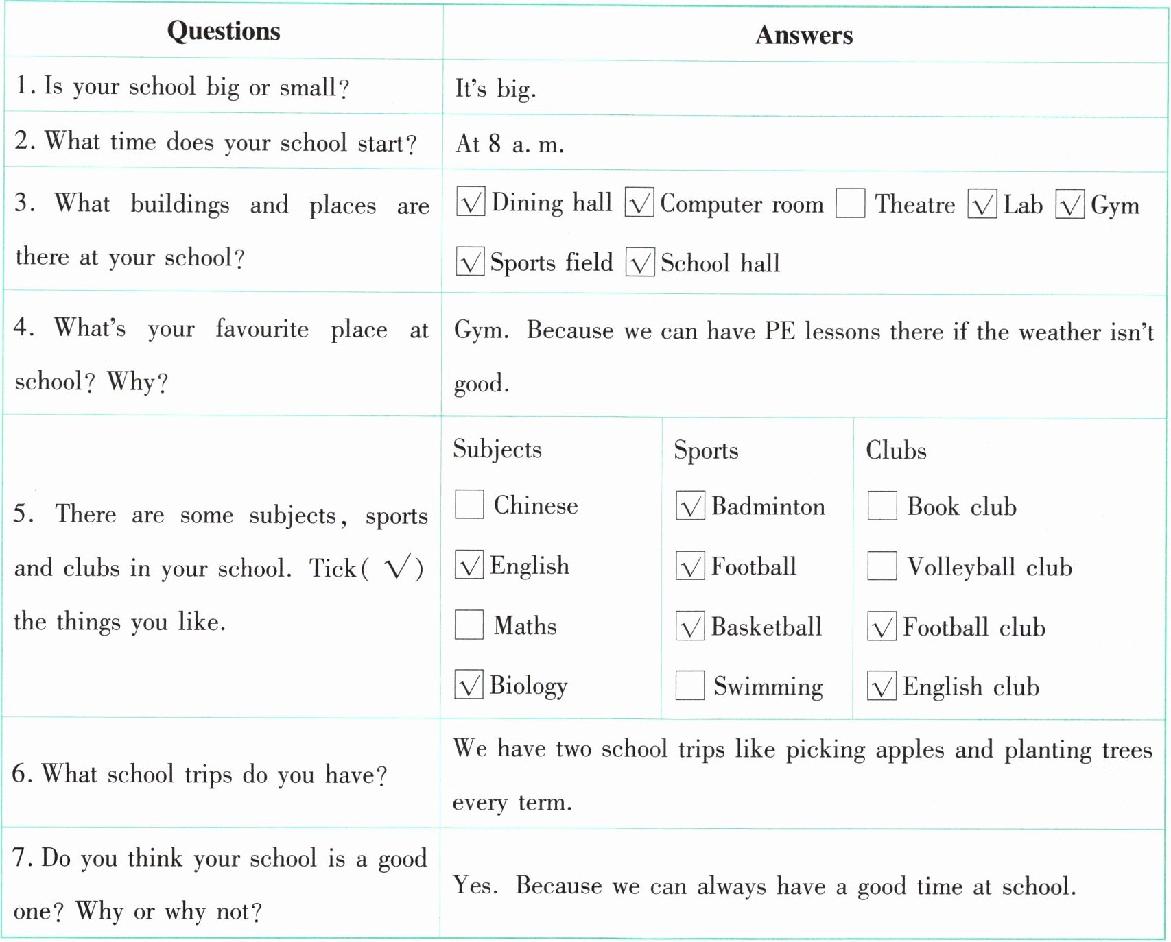 |5. There are some subjects, sports and clubs in your school. Tick(√) the things you like.|Subjects: □Chinese √English □Maths √Biology; Sports: √Badminton √Football √Basketball □Swimming; Clubs: □Book club □Volleyball club √Football club √English club|