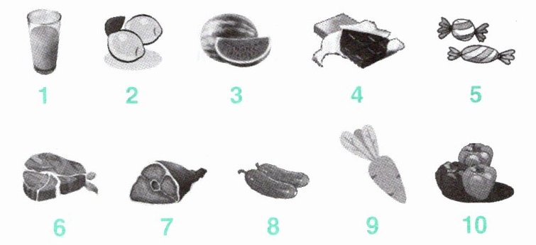 1 juice 2 lemon 3 watermelon 4 chocolate 5 sweets 6 beef 7 pork 8 cucumbers 9 carrots 10 peppers