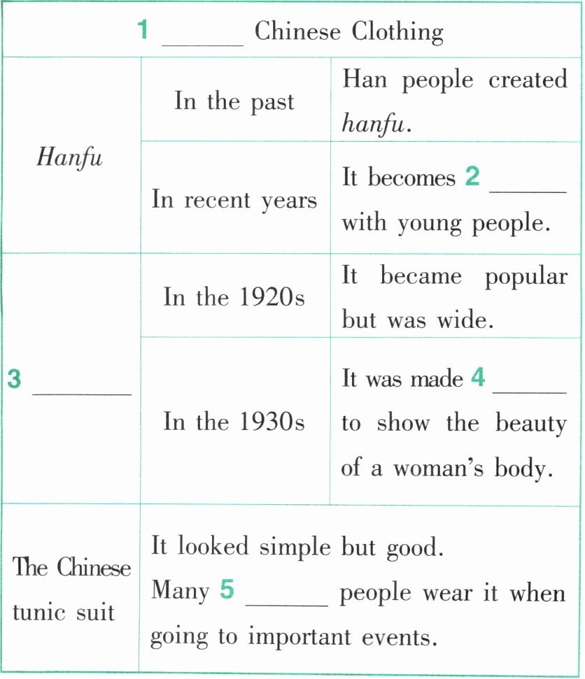 | The Chinese tunic suit | | It looked simple but good. Many 5 ______ people wear it when going to important events. |