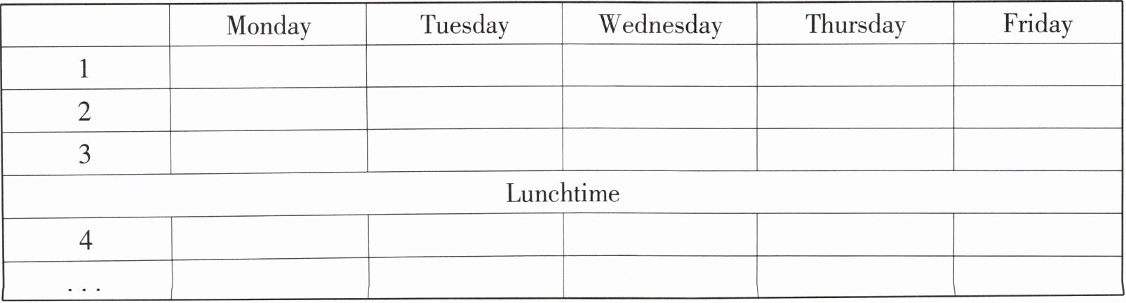 Task 2 Work in groups. Make your own weekly class timetable with different subjects.
