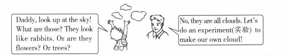 1 D 细节理解题。根据文中父亲所说的“No, they are all clouds”可知,父子俩谈论的是云朵。故选 D。2 D 细节理解题。根据文中的“Very important! Only parents deal with matches!!!”可知,使用火柴时,父母的帮助很重要。故选 D。3 B 图片排序题。步骤 关键细节 对应图片1 Turn the lid upside down and fill it with ice. ①2 Fill the jar about 1.5 cm with very hot water. ③3 Ask your parent to light a match. Then blow out the match just above the jar. ⑤4 Quickly put the lid with ice on the jar. Cover the jar completely. ②5 Then take the lid off and meet the cloud! ④根据上述描述可知,正确的顺序是 B。4 A 细节理解题。根据 Result 右侧的“A real cloud comes up. But it is not round and it disappears soon”可知,结果是会出现真正的云朵,但云朵不是圆形的,并且很快就会消失。故选 A。5 D 文章出处题。本文介绍了一个实验,如何用罐子制作出云朵。由此可推知,这篇文章有可能来自一本科 学杂志。故选 D。