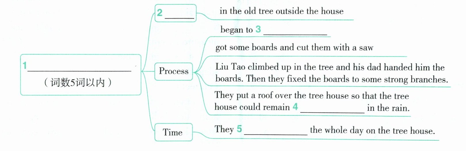 When they finished breakfast,both of them went out to the 4 in their garden and began to measure(测量).Then they got some boards and started to 5 them with a saw(锯子).When the pieces were ready,Liu Tao cl limbed up in the tree and Dad handed him the boards.They fixed the boards to some 6 branches.