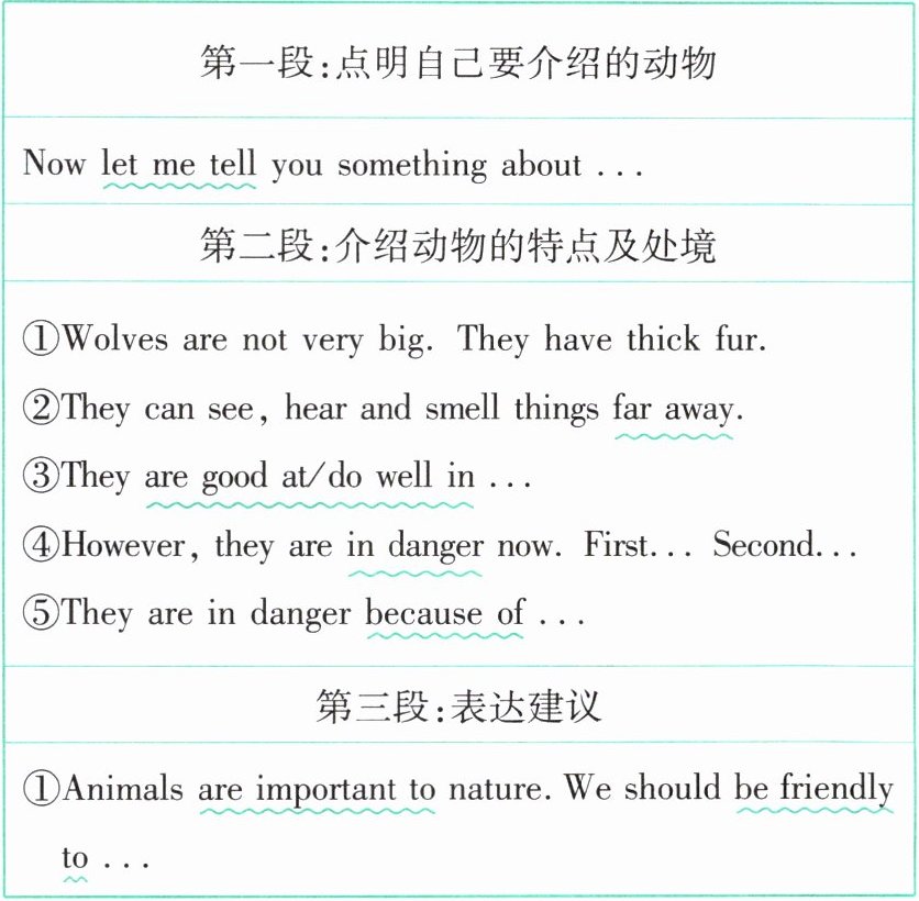 | ①Wolves are not very big. They have thick fur. ②They can see, hear and smell things far away. ③They are good at/do well in ... ④However, they are in danger now. First... Second... ⑤They are in danger because of ... |