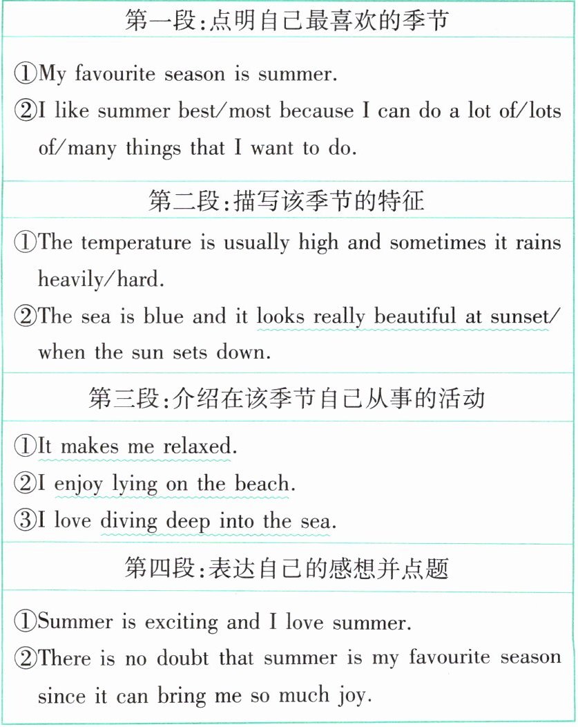 | 第一段:点明自己最喜欢的季节 | ①My favourite season is summer. ②I like summer best/most because I can do a lot of/lots of/many things that I want to do. |