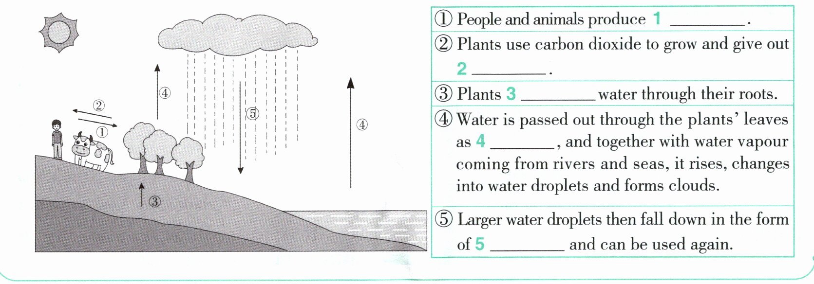 ④ Water is passed out through the plants' leaves as 4 ______, and together with water vapour coming from rivers and seas, it rises, changes into water droplets and forms clouds.