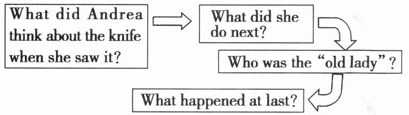 “A knife! He was really dangerous. It was wise to drive him off my car,” Andrea thought. Then she breathed deeply and called the police to tell them what had happened. A moment later, the police came to her. Andrea pointed to the direction the “old lady” might be in. Then the police drove along the road to look for “her”. How amazing! The police were surprised to see that the “old lady” was still standing by the road. The police stopped and said, “Hello, madam. We'd like to take you to Brockboune. Get in, please.” At last, the “old lady” turned out to be a robber.