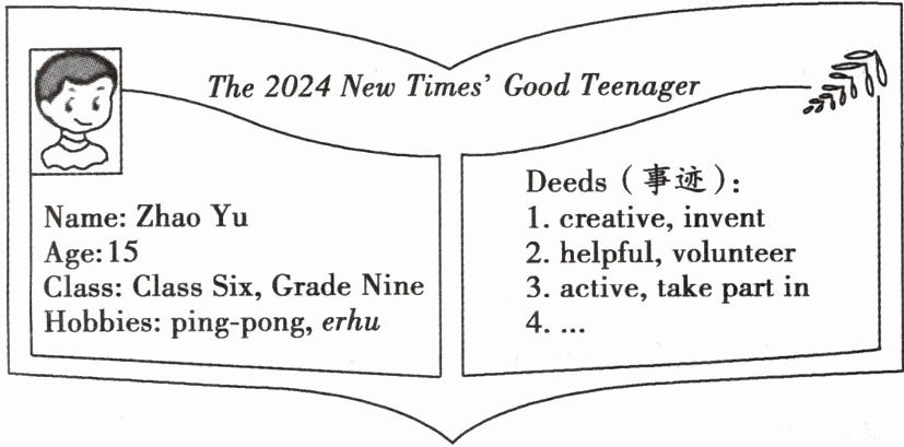 Zhao Yu won the 2024 New Times' Good Teenager award. Now, I'll introduce him to you. Zhao Yu is 15 years old. He is in Class Six, Grade Nine. He has some hobbies. He likes playing ping-pong. He thinks it's relaxing. He is also good at playing the erhu.