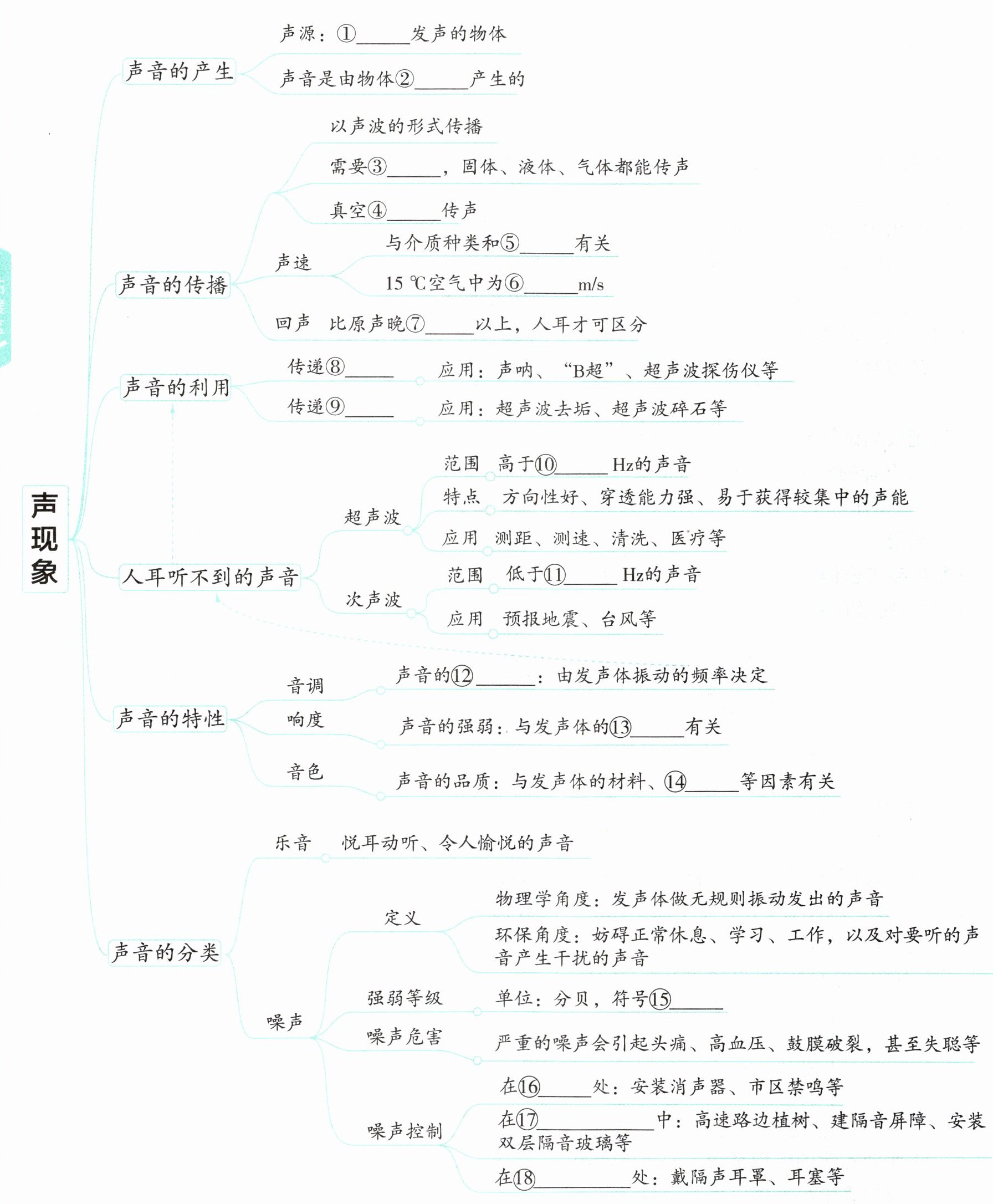①正在 ②振动 ③介质 ④不能 ⑤温度 ⑥340 ⑦0.1 s ⑧信息 ⑨能量 ⑩20 000 ⑪20 ⑫高低 ⑬振幅 ⑭结构 ⑮dB ⑯声源 ⑰传播过程(或声音传播) ⑱声音接收(或人耳)