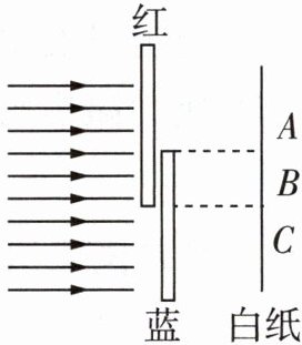 6 [2025 南通海安期中]如图所示,小王在暗室中将红色和蓝色透明玻璃部分重叠放置,在玻璃的右侧放白纸。将太阳光照射到玻璃片上,关于白纸上A、B、C三个区域呈现的颜色的说法正确的是 ( )