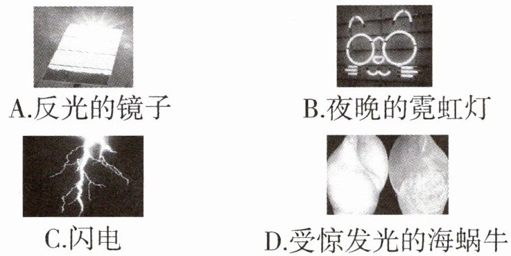 B 镜子本身不发光,不属于光源。夜晚的霓虹灯正在发光,属于人造光源。闪电、受惊发光的海蜗牛属于天然光源。
