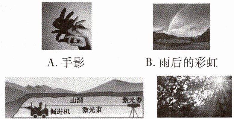 B 光照射到不透明的物体上时,物体会阻挡光的传播,在其背面光不能到达的区域,形成物体的影子,所以,手影是光沿直线传播形成的,A不符合题意;雨后的彩虹是光的色散现象,不能说明光沿直线传播,故B符合题意;应用激光准直技术开凿山洞,利用了光在同种均匀介质中沿直线传播,故C不符合题意;透过树叶的阳光是由光沿直线传播形成的,故D不符合题意。故选B。