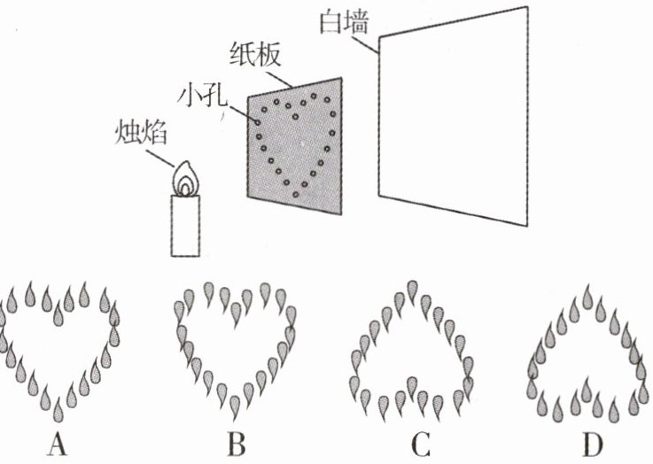 B 由于光在均匀空气中沿直线传播,烛焰的光通过纸板上很小的小孔,在白墙上将观察到一个心形光斑,心形光斑的每个亮点为烛焰倒立的像,这是小孔成像现象。