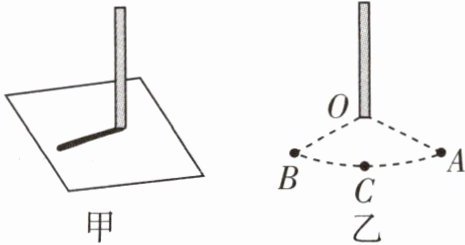 竹竿影子的方位也在不断变化。小星在第二天观察其中一根竹竿的影子,每过30min 在竹竿影子的顶端做一个记号,如图甲所示,测量影长,并画出影子的顶端轨迹。若轨迹上有上午某时刻的A点和下午某时刻的B点,且OA= OB,如图乙所示。则A→B 指向为______,若C点离O点最近,则0→C指向为______。(均填“东”“南”“西”或“北”)