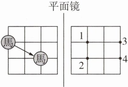 C 平面镜成的像,像和物体到镜面的距离相等,对应点的连线与镜面垂直,所以,棋子“馬”按题图所示箭头方向移动,则平面镜中所显示的棋子“馬”,移动的路径是从“3”到“2”,故C正确。