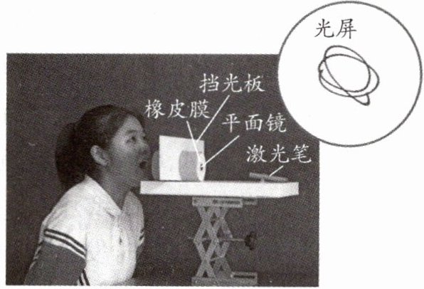 4 [教材 P17T2改编][2025 苏州吴江区期中改编]如图所示,在两端开口的圆筒的一端蒙上橡皮膜,并在橡皮膜的中央贴一块平面镜,将圆筒插入挡光板的圆孔中。当激光笔发出的一束光射向镜面时,在激光笔后方的光屏上会呈现一个亮点。关于此实验,下列说法正确的是( )