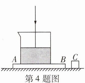 4 [易错][2025 南京第二十九中月考]一个烧杯中装有半杯水,放在水平木板AB上,一束光线竖直向下照在水面上。现在B端下方垫一个小木块C,使木板倾斜5°,则此时水面上的反射角会______(填“变大”“变小”或“不变”)。若此时保持入射点不变,使入射光线顺时针转过10°,则此时的反射角为______。