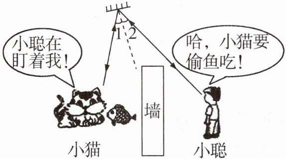 3 如图所示,是关于小猫和小聪的一幅漫画,图中两条光线的夹角是60°,则小聪观察小猫光路的入射角是______(填“∠1”或“∠2”),它的大小是______,此现象说明在反射时,光路是______。