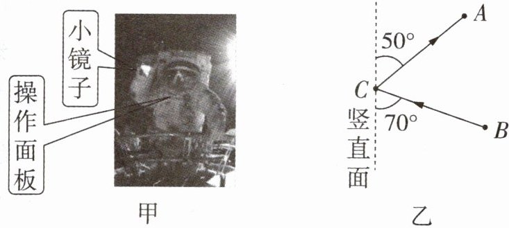 7 新情境 [2023 宜昌中考]航天员舱外作业时,宽厚的航天服限制了他的视野,为了看清胸前的操作面板,可以通过手腕处的小镜子(如图甲所示)进行观察。图乙中A点代表航天员的眼睛,B点代表胸前某一按钮,C点是小镜子的位置,请你根据反射光路图在C点准确画出镜面并标出镜面与竖直面的夹角。(保留作图痕迹)