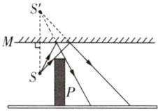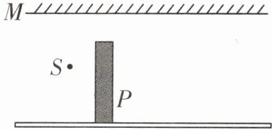 6 如图所示,在某房间的天花板上装有平面镜M,S为一灯泡,P为不透明的墙。请画出灯泡发出的光经平面镜反射后,能够照亮P墙右侧区域的光路图。