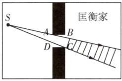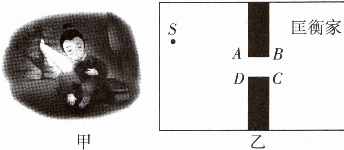 1 [2025 泰州月考]成语“凿壁偷光”,是指西汉匡衡凿穿墙壁引邻家之烛光读书一事(如图甲所示)。其原理可简化成如图乙所示的模型:S为邻家烛焰,ABCD是匡衡在厚墙壁上凿穿的方形孔洞,请作出邻家蜡烛在匡衡家照亮的范围(用阴影线表示),完成相应光路图。