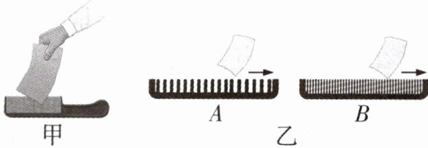 4 [教材 P19 图1-14 改编][2025 靖江八校联盟月考] 如图甲所示,拿一张硬纸片,让它在塑料梳齿上划过,划得快时,发出的声音的音调高,这说明音调跟发声体振动的______有关。如图乙所示,用硬纸片在A、B两把塑料梳子的齿上用同样的速度划两次,则硬纸片在______(填“A”或“B”)梳子上划过时发出的声音的音调低。