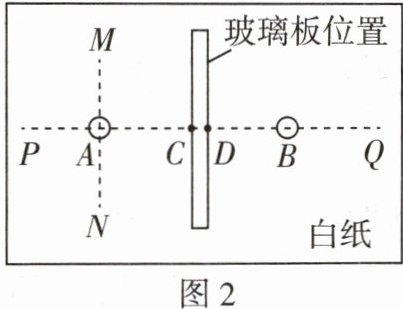 (2)将棋子A置于玻璃板前方,观察到A的两个像,在玻璃板后方放置棋子B,使之与棋子A较亮的像重合。在白纸上记下棋子A和B的位置,如图2所示,此时物到镜面的距离为______,像到镜面的距离为______(以上两空均填“AC”“AD”“BD”或“BC”)。可沿______(填“MN”或“PQ”)方向移动棋子A多次实验,寻找普遍规律。