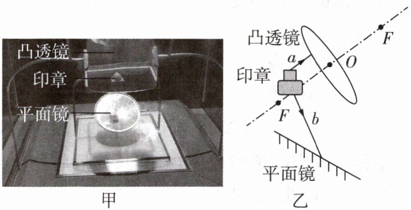 5 [新情境][2023 成都中考]如图甲所示是博物馆内“刘充国印”的展台,上方是凸透镜,透过它能看到放大的印章;下方是平面镜,通过它能看到印章底部的字。图乙是其示意图,F为凸透镜的焦点,O为凸透镜的光心,光线a平行于凸透镜的主光轴(图中虚线)。请在图乙中画出: