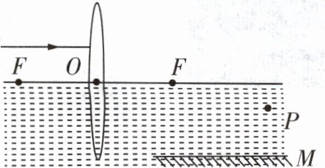 8 [2025 西安国际港务区陆港中学月考]如图所示,凸透镜的主光轴与水面重合,F是凸透镜的焦点,水下有一块平面镜M,一束与水面平行的光线经凸透镜折射后进入水中,再经水中的平面镜反射后恰好过P点,请将光路图补充完整。