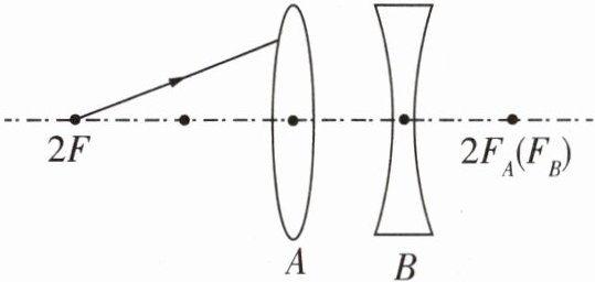 [解析] A、B两透镜的焦距相同,凹透镜B刚好放在凸透镜A的焦点位置,凹透镜B右侧的虚焦点在凸透镜A右侧的二倍焦距位置,根据凸透镜成像规律,物距等于二倍焦距,像距等于二倍焦距,成倒立、等大的实像,从凸透镜左侧二倍焦点位置发出的光线,经过凸透镜折射后指向右侧二倍焦距处,即射向凹透镜右侧虚焦点,所以光线经凹透镜折射后将平行于主光轴射出。