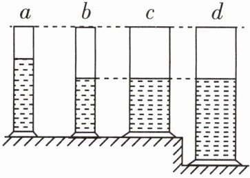 6 [2025 盐城海都中学段考] 有四个材料相同、厚度相同的玻璃量筒,其中a、b等高、等横截面积;b、c等高,b的横截面积小于c;c与d不等高,但横截面积相同。各量筒内装有如图所示的水,某同学根据听音调的高低猜想空气柱振动发声的频率可能与:①空气柱的长短有关;②空气柱的横截面积有关;③水柱的长短有关。