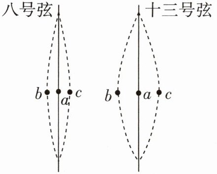 4 [2025 南京玄武区四校联考期中] 分别拨动古筝的八、十三号弦,如图所示,用同一设置的相机拍摄到两弦最左摆到b处,最右摆到c处,静止时在a处。测出每振动880次,八号弦用时2s,十三号弦用时4s,则八号弦发出的声音( )