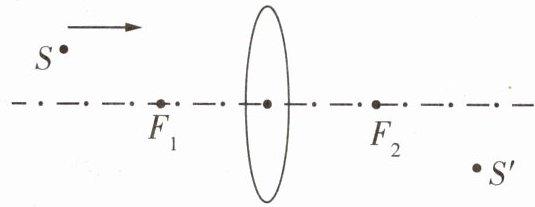 4 [2025 江阴澄要片期中]如图所示$,F_1、$$F_2$是凸透镜的焦点,S是放在凸透镜前的点光源,S'是S经凸透镜所成的像。当点光源S沿平行于主光轴的方向靠近凸透镜时(始终保持u>f),像S'移动的情况是( )