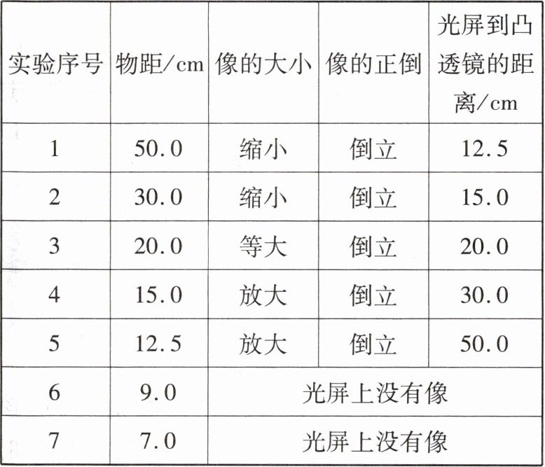 |实验序号|物距/cm|像的大小|像的正倒|光屏到凸透镜的距离/cm|