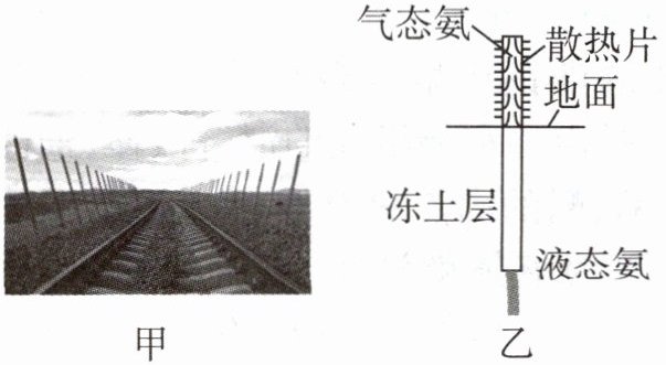 7 教材P103 图4-20改编 如图甲所示为青藏铁路冻土区路基两侧的“热棒”,图乙是“热棒”的内部示意图。工作时,下端的液态氨吸收冻土层的热量______(填物态变化名称)成气态氨;上端的气态氨通过散热片______(填“吸热”或“放热”)液化成液态而重新回到下端。使用它能对路基进行______(填“降温”或“升温”),从而防止夏季冻土熔化。
