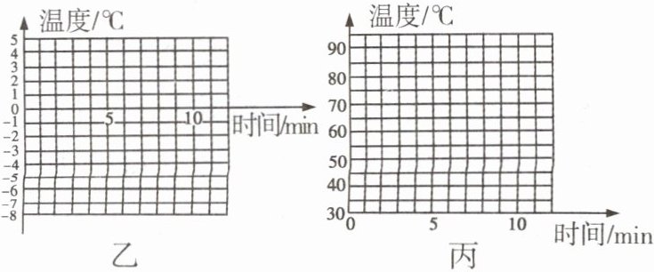 (3)[数据处理]请你根据数据分别在图乙和图丙中画出冰与松香熔化时的温度—时间图像。